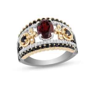 Crafted in sterling silver, this openwork style features a regal red garnet set in a 10K yellow gold star. A row of brilliant sapphires and a V-shaped diamond ribbon accentuate the center, creating a tiara-like look. Enchanting with 1/15 carat diamonds and a brilliant polish, this selection is an epic take on modern design. This ring is only available in size 7. Sterling silver rings cannot be resized after purchase.