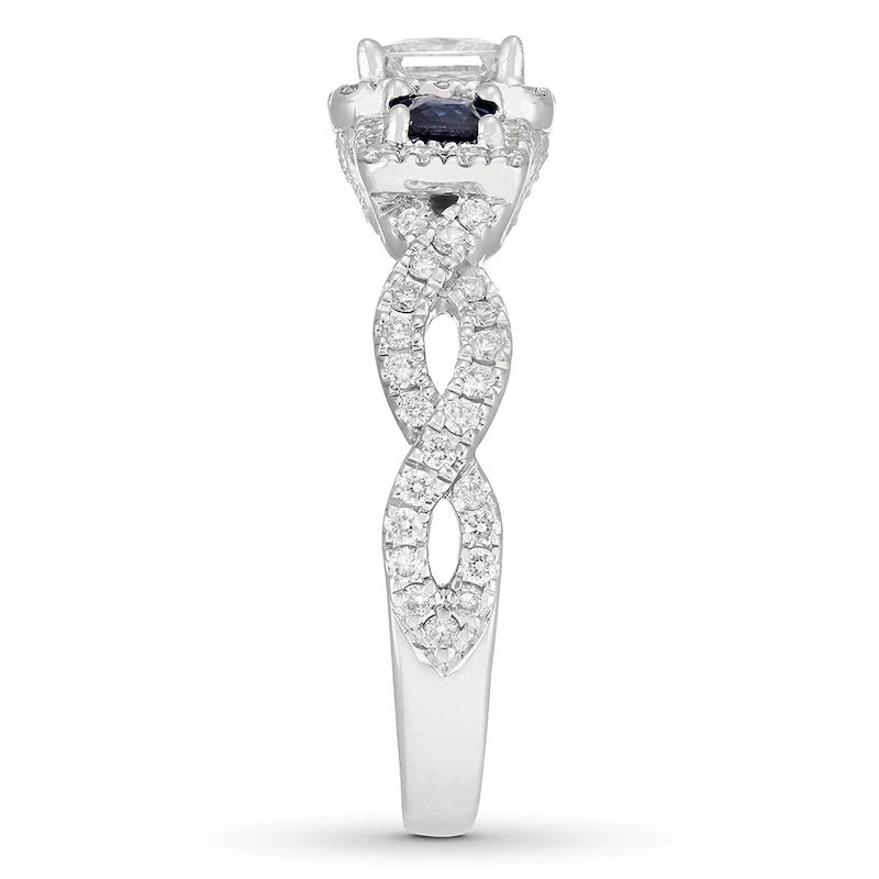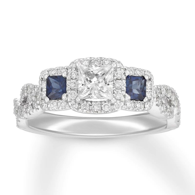 This stunning engagement ring combines vintage and modern styles for one unforgettable design. The ring features a brilliant 1/2 carat princess-cut diamond and two square natural sapphires for an update on the classic three-stone style. Dazzling round diamonds twist on the band and halo the center to complete the look. The 14K white gold ring has a total diamond weight of 7/8 carat.